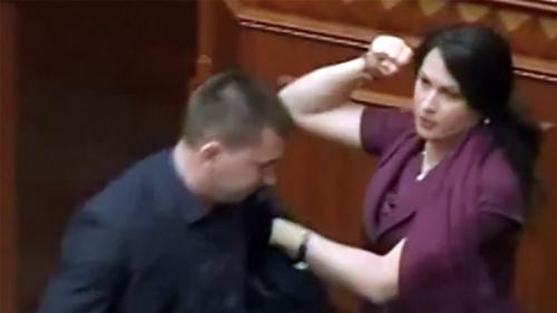 Расмда кўриб турганингиздек, Олий Раданинг аёл депутати эркак депутатга мушт урмоқда. Бу аёл – миллатчи руҳдаги “Озодлик” Партияси рўйхати бўйича сайланган депутат бўлиб, мушт еган депутат эса, руспарастлиги билан танилган Коммунистик Партиянинг лидери Петр Симоненкодир.