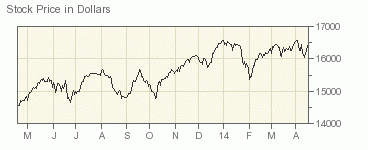 Мана, расмда Dow Jones индексининг 1 йиллик ўзгаришини кўрмоқдасиз. 2013 йили ўртача олганда асосан ўсиш бўлди, январда катта тушиш бўлса ҳам, кейинги умумий ўсишлар ичида тушишлар ҳам бор. Демак, ҳозир АҚШда яшаётганлар учун пулни фондлар бозорининг акцияларида сақлаш фойдалироқ. Банкда бериладиган фоиз жуда кичкина бўлгани сабабли, пулини фонд биржасининг акцияларида сақлаётганлар катта фойда олмоқдалар.