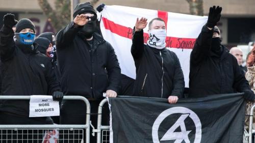 The Sunday Times газетасидан олинган расм неонацистларнинг 2016 йилдаги намойишларидан бирини кўрсатмоқда, у ерда бир варақлик кичкина қоғозда “Бошқа мачитлар бўлмайди” сўзлари ёзилган.