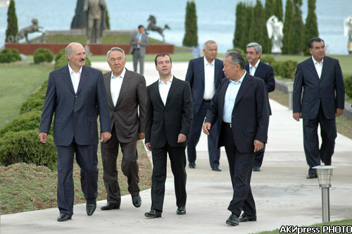 Бир соатча аввал Коллектив Хавфсизлик Шартномаси Ташкилотига кирувчи мамлакатлар раҳабарларининг норасмий йиғилиши ўз ишини тамомлади. Саммитда Серж Саргсян (Арманистон), Александр Лукашенко (Беларусия), Нурсултон Назарбаев (Қозоғистон), Қурманбек Бақиев (Қирғизстон), Эмомали Раҳмон (Тожикистон), Ислом Каримов (Ўзбекистан) ва КХШТнинг Бош котиби иштирок этди.Норасмий йиғилишда келишилган масалалардан бири – координация қилинадиган умумий информацион сиёсат юритиш бўлди. Шу сабабли бўлса керак, ҳалигача Қирғизистоннинг давлат хабар муассасаси бўлмиш Кабар агентлиги саммит ёпилгани ҳақида хабар тарқатишга улгурмади.